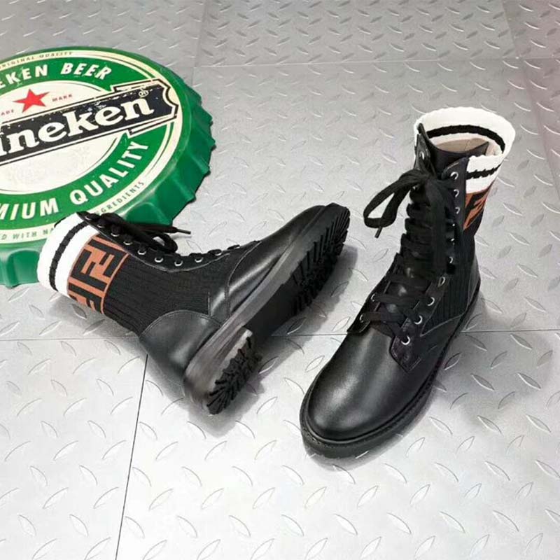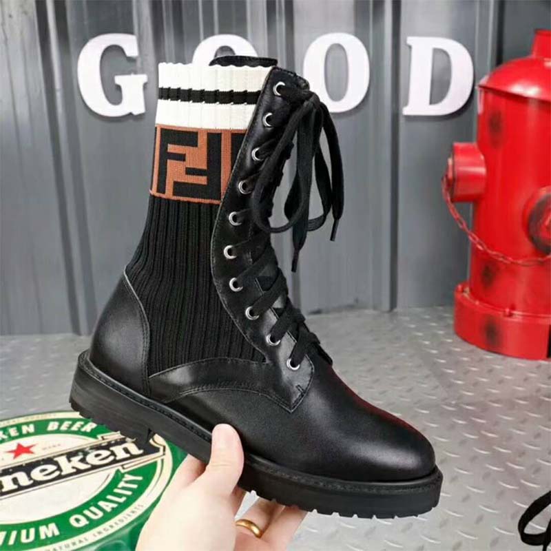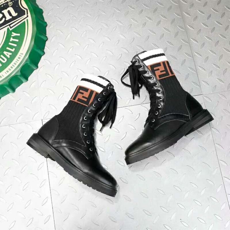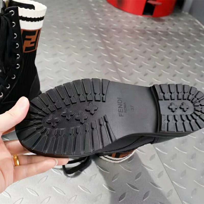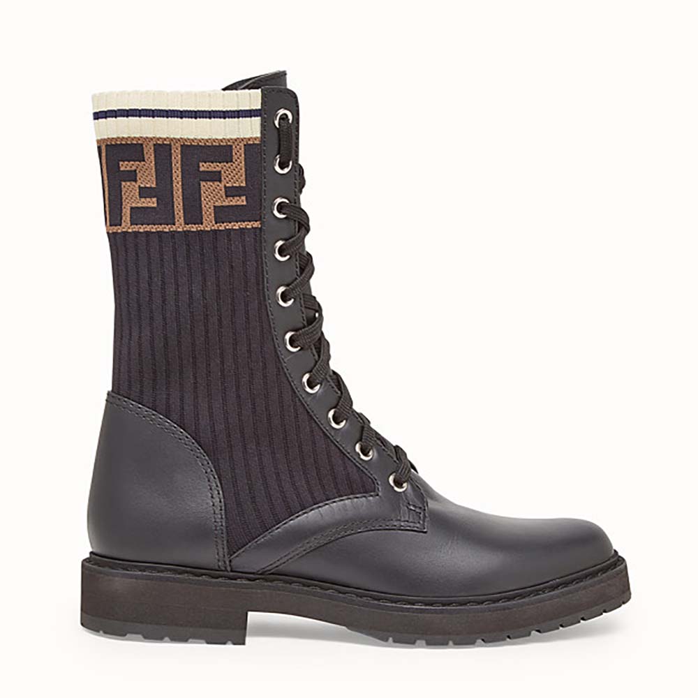 - La jambe de la botte en forme de chaussette est ornée du motif FF et de rayures sportives contrastées.