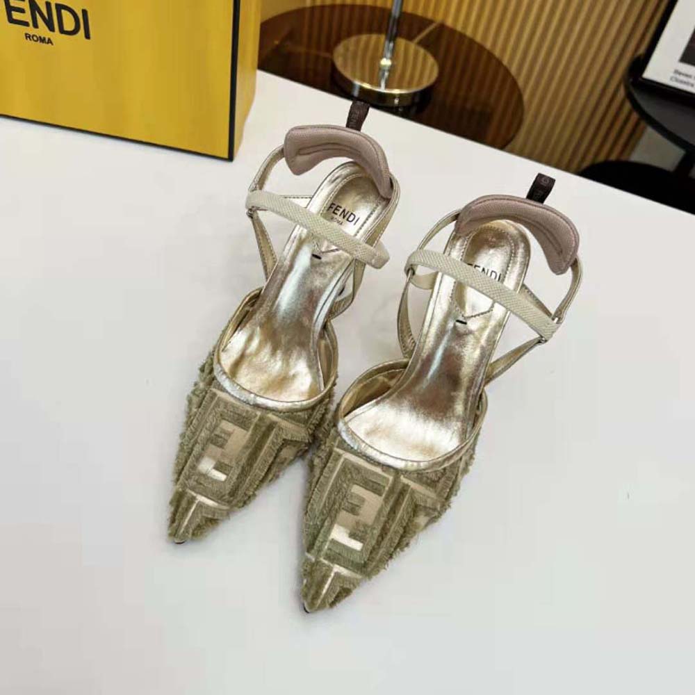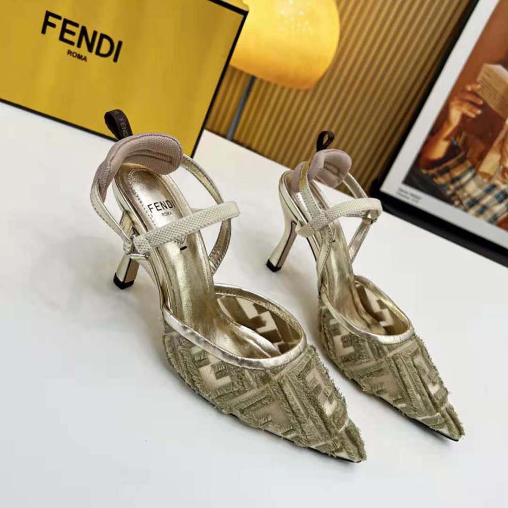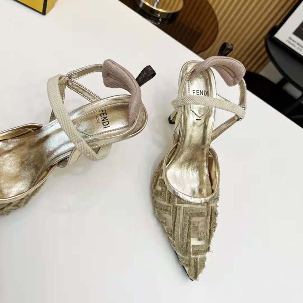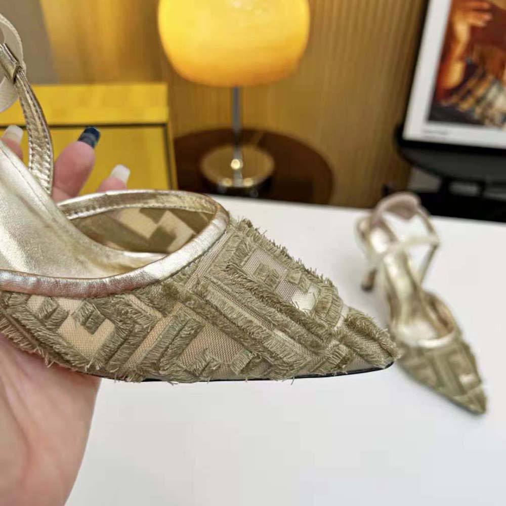- La semelle est ornée de inserts en caoutchouc. Fabriqué en micro-maille dorée avec motif FF brodé à franges.