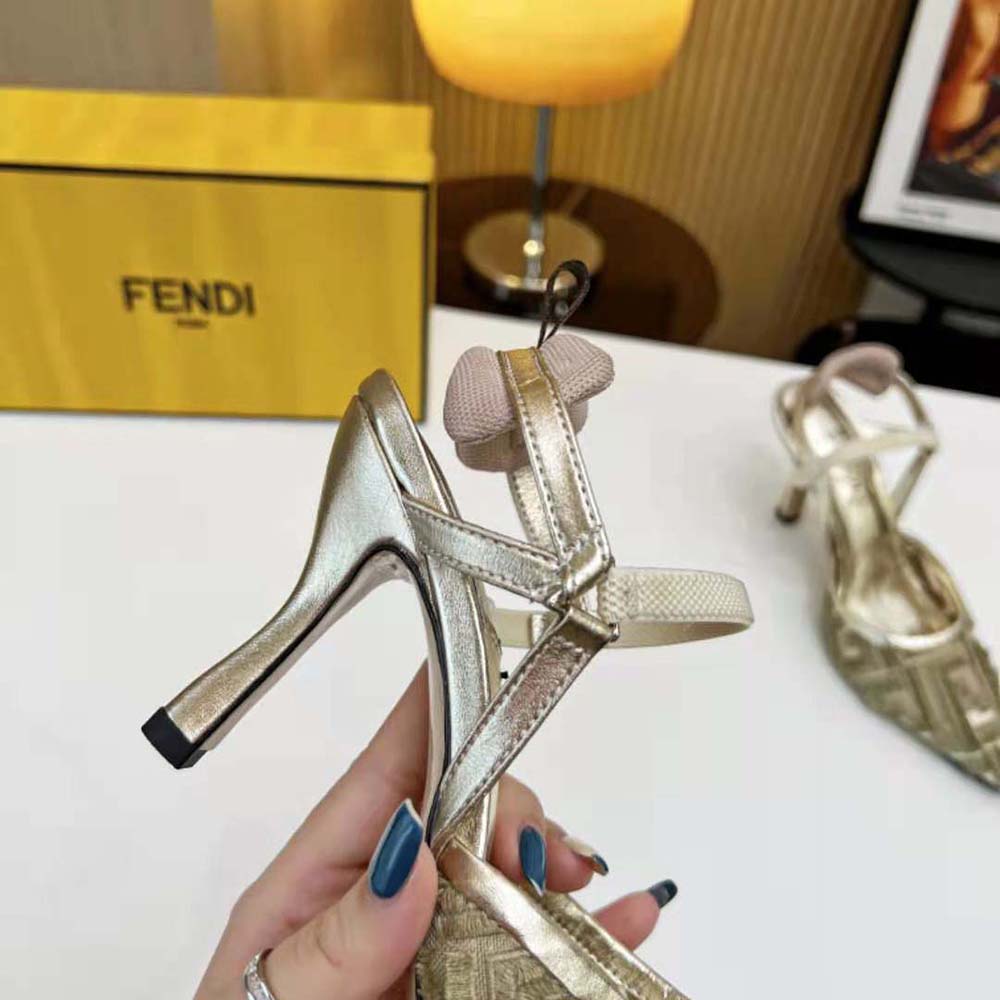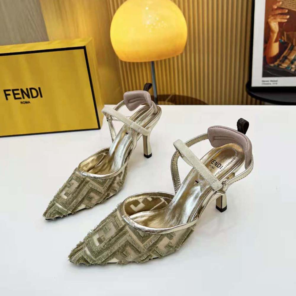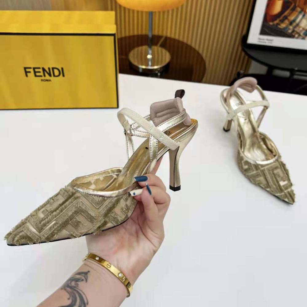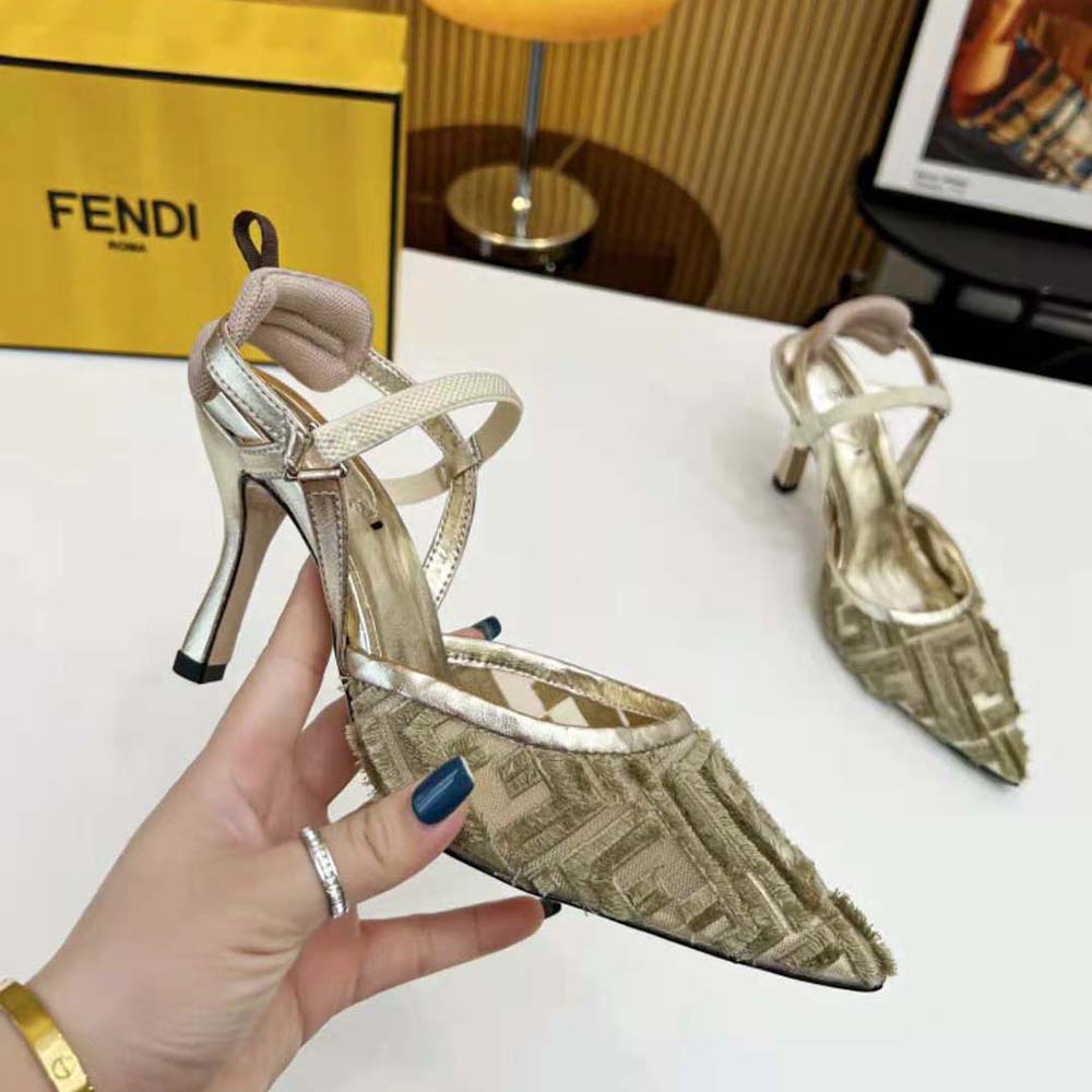 - La semelle est ornée de inserts en caoutchouc. Fabriqué en micro-maille dorée avec motif FF brodé à franges.